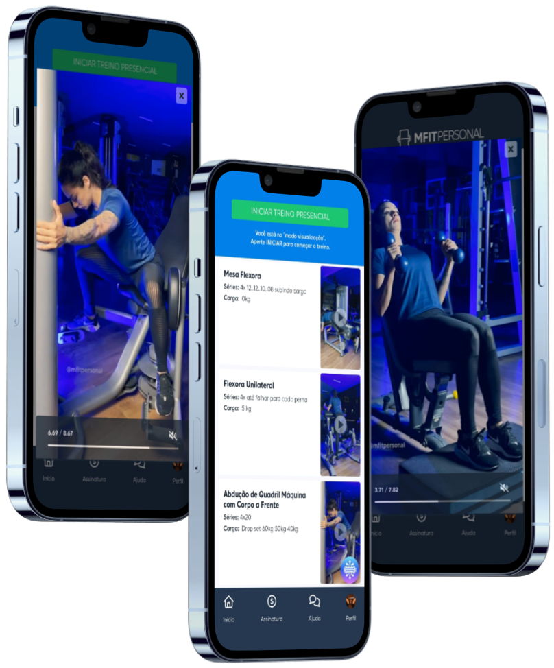O seu acompanhamento físico é desenvolvido de forma estratégica e estruturado em um aplicativo interativo. Nele, você tem acesso ao seu treino individualizado com vídeos explicativos de cada exercício, garantindo um movimento seguro. Você também pode registrar suas cargas, acompanhar sua progressão planejada e ter suporte direto com o personal para tirar dúvidas.