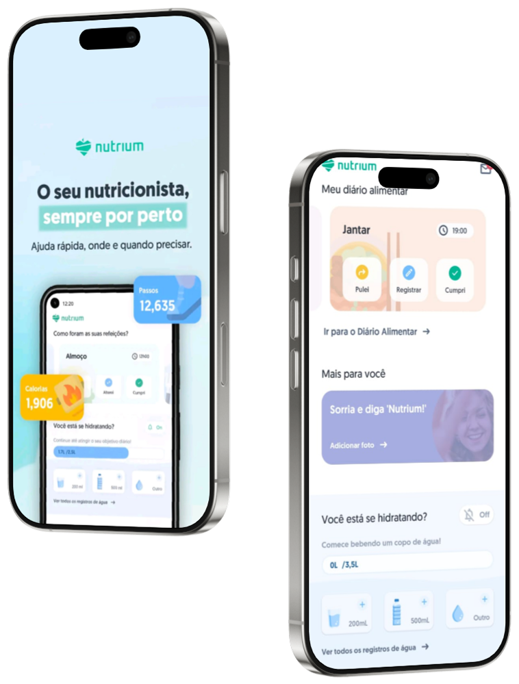 O seu plano alimentar fica 100% digital e acessível. Pelo aplicativo exclusivo do nosso nutricionista, você acessa suas refeições do dia, lista de compras, recebe lembretes para beber água e acompanha a sua evolução de medidas de forma visual e motivadora.